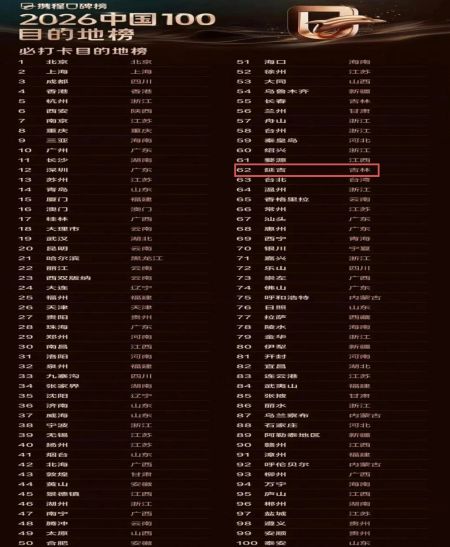 近日,攜程口碑榜正式發(fā)布“2026中國100目的地榜”,延吉憑借高漲的人氣與突出的綜合實(shí)力,成功入選,位列必打卡目的地第62名。這也是延吉連續(xù)三年榮登該榜單。