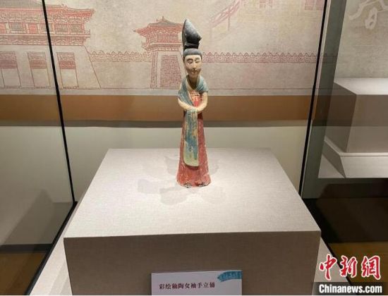 2023年12月,在吉林長春舉辦的“柳絲梅綻正芳菲——初唐女性生活掠影展”上,展出的昭陵陪葬墓出土的彩繪釉陶袖手女立俑,頭梳單刀半翻髻!±畹 攝