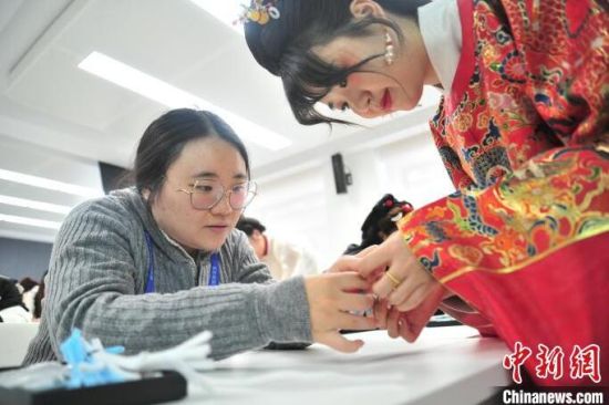 1月23日,巫珮瑄(左)在吉林長春學習制作漢服手工仿絨花雪花胸針!
