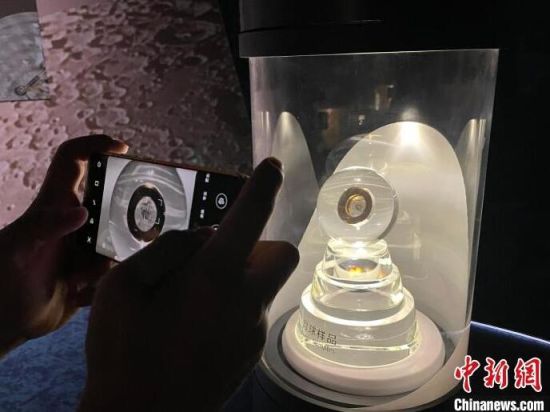 2021年7月17日,全球建筑規(guī)模最大的天文館——上海天文館開館。當(dāng)天的開館儀式上,與會嘉賓為“天外來物”——月壤入館揭幕。該部分月壤樣品被封裝在水晶球中,供觀眾近距離觀看。(資料圖) 中新社記者 鄭瑩瑩 攝