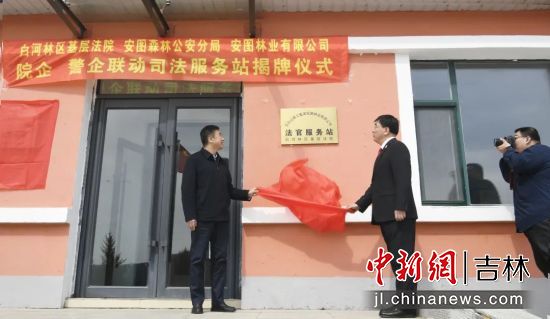 會(huì)后,在島安林場(chǎng)室外舉行了司法服務(wù)站揭牌儀式。為法官服務(wù)站、警長(zhǎng)服務(wù)站揭牌,院企、警企聯(lián)動(dòng)機(jī)制啟動(dòng)儀式勝利閉幕。院警企三方已通過協(xié)商達(dá)成共識(shí),并在當(dāng)?shù)?個(gè)林場(chǎng)設(shè)立司法服務(wù)站,為“接警到場(chǎng)”“送法到戶”,提供強(qiáng)有力的保障。