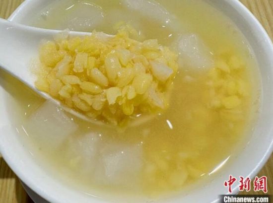 “世界糖水在中國,中國糖水在廣東。”對廣州人而言,在炎熱的夏日或寒冷的冬夜,與好友相約糖水鋪,“食”上一碗滋補的糖水,甜蜜就能讓整個人“充滿電”。圖為馬蹄綠豆爽。 中新社記者 王堅 攝
