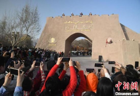 日前,中新社記者在喀什古城景區(qū)東門看到,三四百名游客共賞開城儀式。隨著音樂聲歇、舞蹈曲散,游客們從東門魚貫而入尋找“詩和遠(yuǎn)方”,用相機(jī)拍一張“歲月靜好”的圖片,或者買些旅游紀(jì)念品送親朋好友。