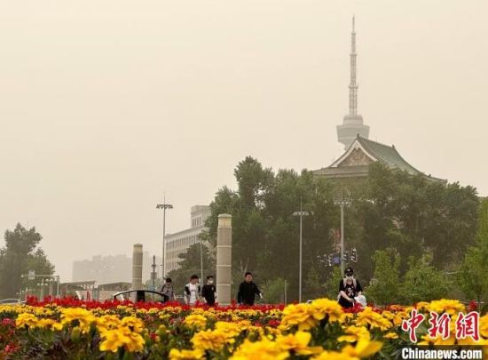 長春文化廣場雕塑。 郭佳 攝市民在公園散步!」选z城市上空昏黃一片!」选z沙塵天氣使能見度降低!」选z城市綠樹被沙塵籠罩!」选z