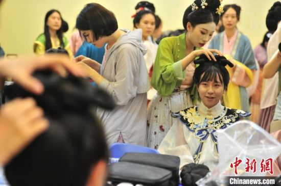 7月9日,吉林四平,2024年全國臺(tái)聯(lián)第二十一屆臺(tái)胞青年千人夏令營吉林分營的30余位臺(tái)胞青年參加傳統(tǒng)文化講座,學(xué)習(xí)漢服禮儀、漢服種類劃分等知識(shí),并第一次穿上漢服進(jìn)行體驗(yàn),感受傳統(tǒng)文化之美。圖為臺(tái)胞青年在進(jìn)行漢服妝造。高龍安 攝