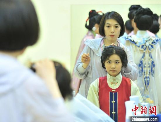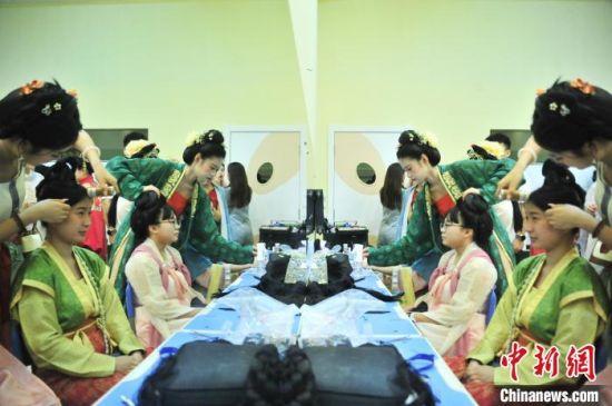 7月9日,吉林四平,2024年全國臺(tái)聯(lián)第二十一屆臺(tái)胞青年千人夏令營吉林分營的30余位臺(tái)胞青年參加傳統(tǒng)文化講座,學(xué)習(xí)漢服禮儀、漢服種類劃分等知識(shí),并第一次穿上漢服進(jìn)行體驗(yàn),感受傳統(tǒng)文化之美。圖為臺(tái)胞青年在進(jìn)行漢服妝造。