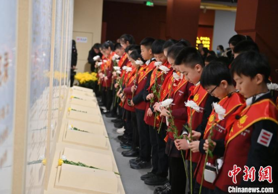 12月13日,在位于吉林長春的東北淪陷史陳列館,民眾在向英烈名錄獻花。當天,偽滿皇宮博物院暨東北淪陷史陳列館聯(lián)合社會各界人士,共同舉辦“千秋忠烈 百世遺芳”南京大屠殺死難者國家公祭日悼念活動,沉痛悼念南京大屠殺死難同胞以及在抗日戰(zhàn)爭中獻出生命的革命英烈。中新社記者 張瑤 攝