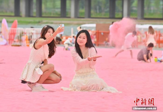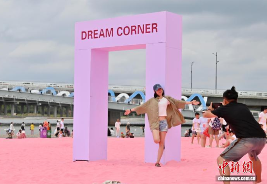 7月24日,長(zhǎng)春市一處人工打造的粉沙灘吸引眾多游客前來(lái)打卡。這片沙灘呈現(xiàn)出夢(mèng)幻的粉色,搭配周邊綠植和休閑設(shè)施,營(yíng)造出浪漫氛圍。中新社記者 張瑤 攝