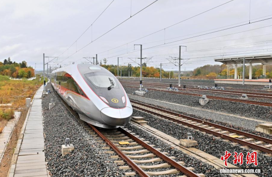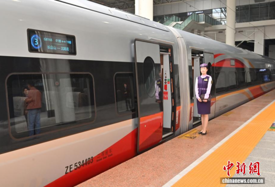 9月28日,G8166次列車從長白山站始發(fā),駛向終點站沈陽北站,沈白高鐵正式開通運營,結(jié)束了吉林省通化、白山兩市不通高鐵的歷史,北京朝陽站、沈陽北站至長白山站的最短旅行時間分別為4小時33分、1小時53分。作為中國東北高鐵網(wǎng)重要組成部分,該線路對暢通區(qū)域經(jīng)濟(jì)循環(huán)、促進(jìn)沿線旅游資源開發(fā)等具有重要作用。中新社記者 張瑤 攝