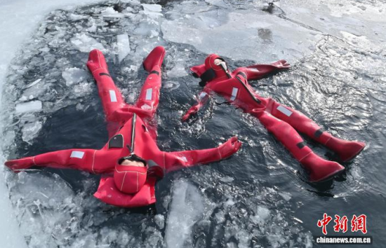 2月5日,吉林省長(zhǎng)春市,一項(xiàng)獨(dú)特的冰浮項(xiàng)目吸引眾多游客前來(lái)體驗(yàn)。在嚴(yán)寒天氣中,參與者身穿醒目的紅色浮力裝備,悠然漂浮于冰面之上,感受別致的冰雪樂(lè)趣。圖為游客在下水前拍照留念。中新社記者 張瑤 攝